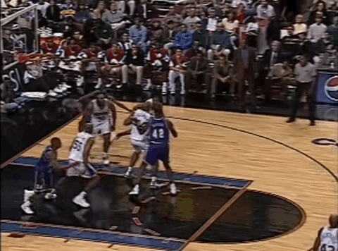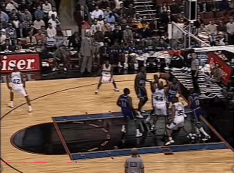 当时联盟的进攻风格与现在天差地别——那仍属于内线的末法时期,比赛节奏普遍缓慢而沉闷,进攻大多要围绕大个子球员展开。1990年选秀的状元秀德里克-科尔曼是76人半场进攻的核心,只要他在场,球队就会尽量将球交到低位由他发起。而斯塔克豪斯作为球队上个赛季的头号得分手,同样需要在侧翼和低位获得进攻机会。贵为状元,艾弗森也不得不先学会给老大哥们“打下手”,常常需要等待队友落位,再伺机传球。然而,当比赛进入攻防转换,赛场对艾弗森而言便豁然开朗。这是他最能展现运动天赋的舞台:上半场他砍下11分4助攻,大部分的进球都来自快攻,包括一记技惊四座的一条龙劈扣。