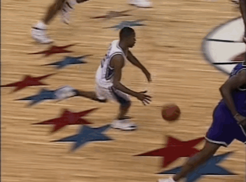 初次踏上NBA赛场的阿伦-艾弗森,形象与人们日后熟知的经典模样尚有几分不同:他尚未留起标志性的地垄沟发型,一头利落短发显得青涩而干练;他也没有佩戴标志性的头带和袖套,但是脚上“黑脚趾”配色的锐步Question球鞋依旧夺目。比赛开场,艾弗森打得很有侵略性,很快展现出自己绝对的速度优势,但前三次出手要么被对手拦下,要么直接三不沾。两幕插曲或许点燃了他的斗志:先是同届选秀的5号秀雷-阿伦在他头上投进了生涯首分,“君子雷”在转换中找到了艾弗森,一记突破后的背后运球把他晃了个趔趄,然后稳稳投进了大空位中投;紧接着,杰里-斯塔克豪斯很快还以颜色,他接球后以迅雷之势摆脱阿伦,上演了一次十佳球级别的反身扣篮。